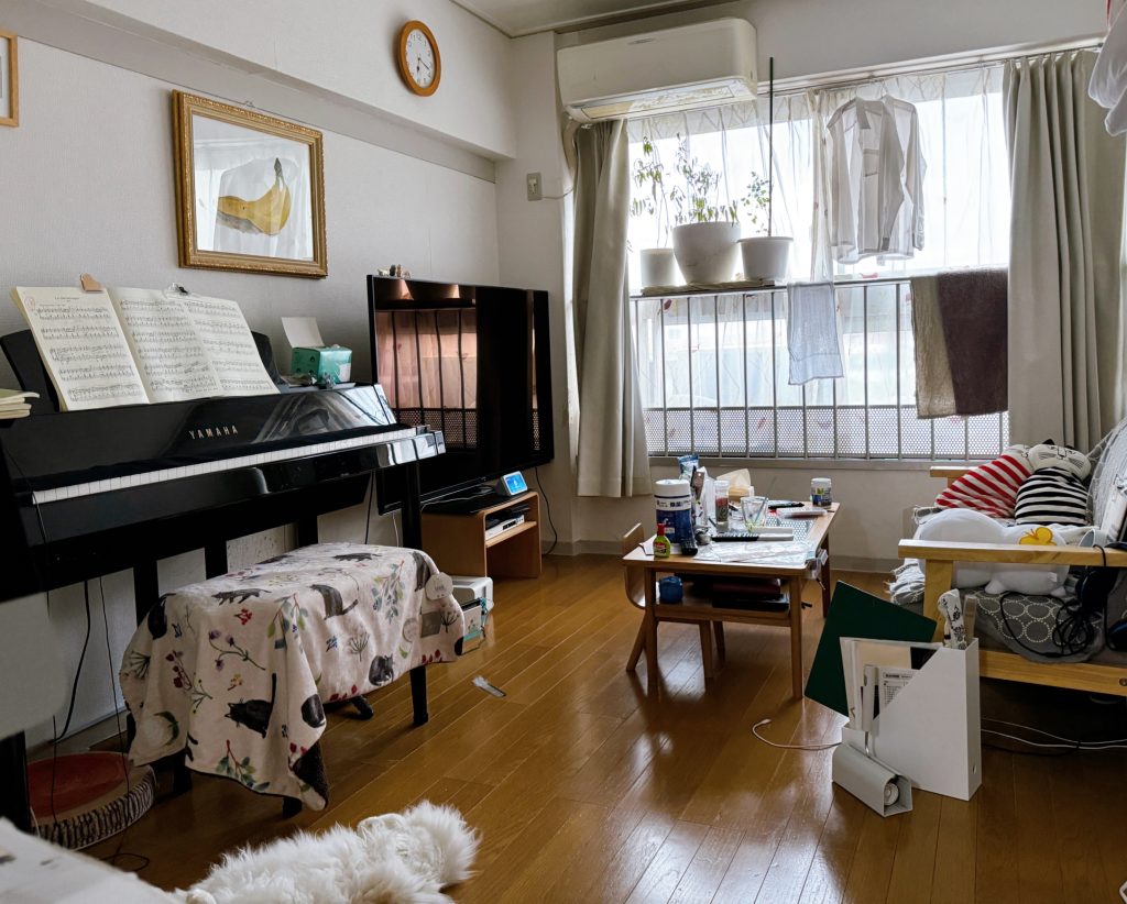 うちはピアノとテレビがどうしても大きいので、壁側にモノトーンのものを寄せて、ほかはなるべく色のないものを置くようにしています。