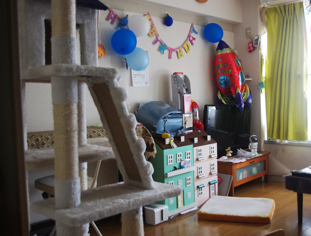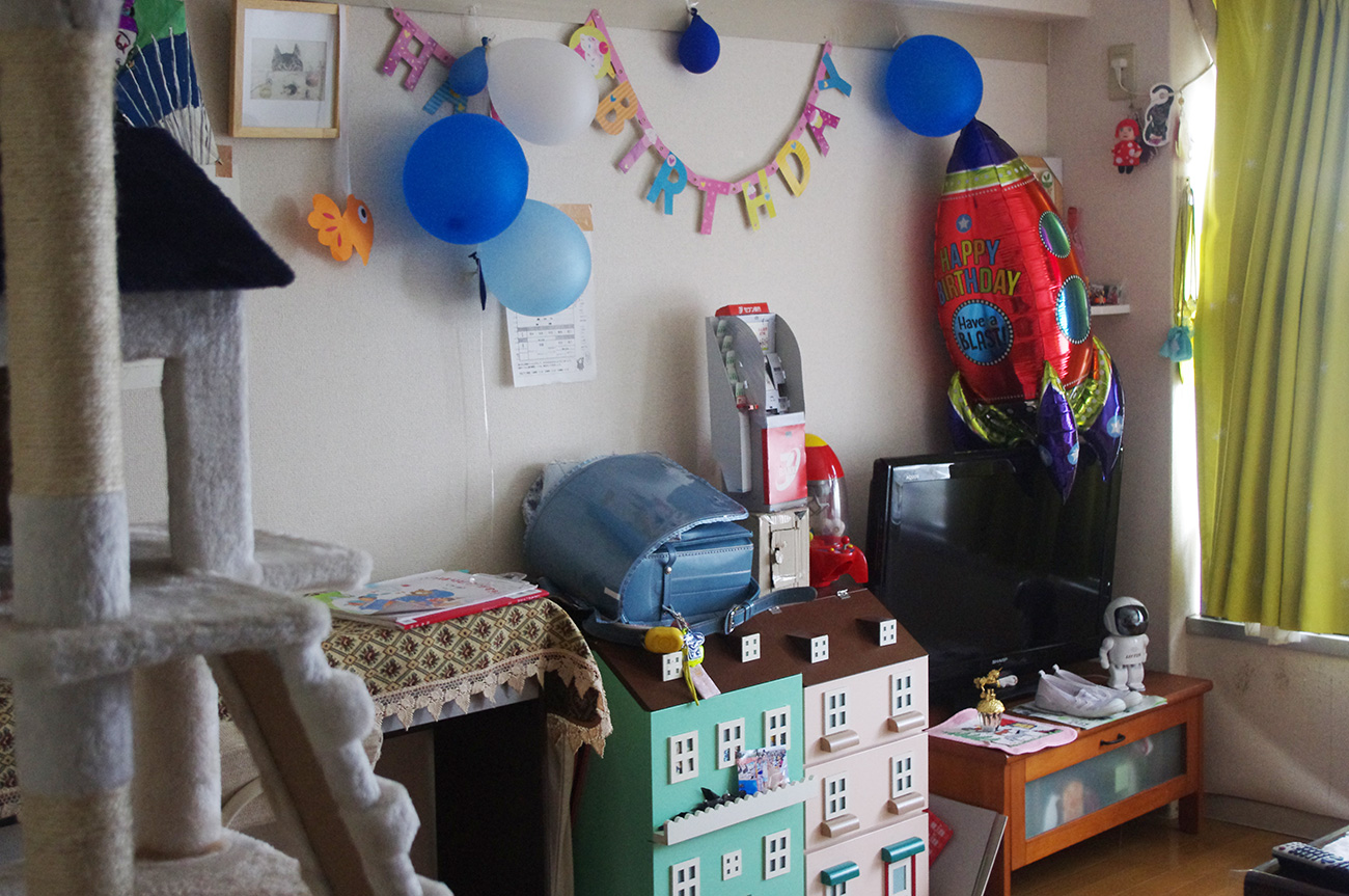 この写真は、子供の誕生日のあとだったので、壁に飾ったガーランドと風船、アルミバルーンの色がさらに色を増やしています。かわいいけど、これは散らかる・・・!
