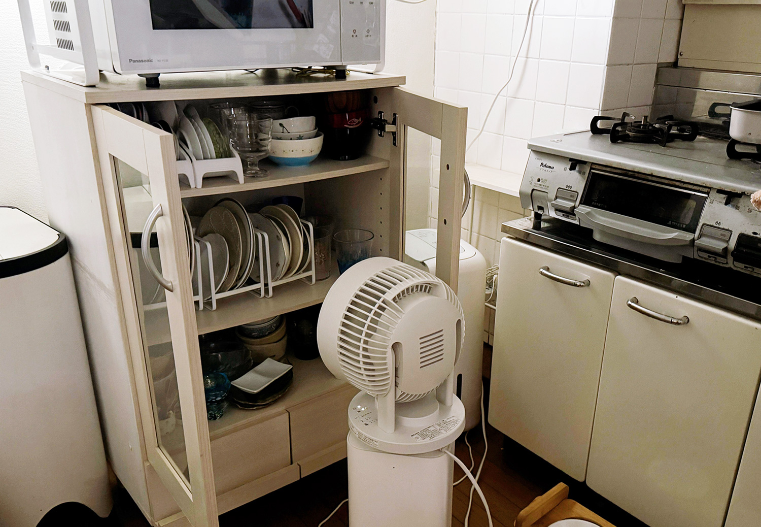 わが家は狭いので、小さい食器棚をガスのすぐ近くに置いているうえに