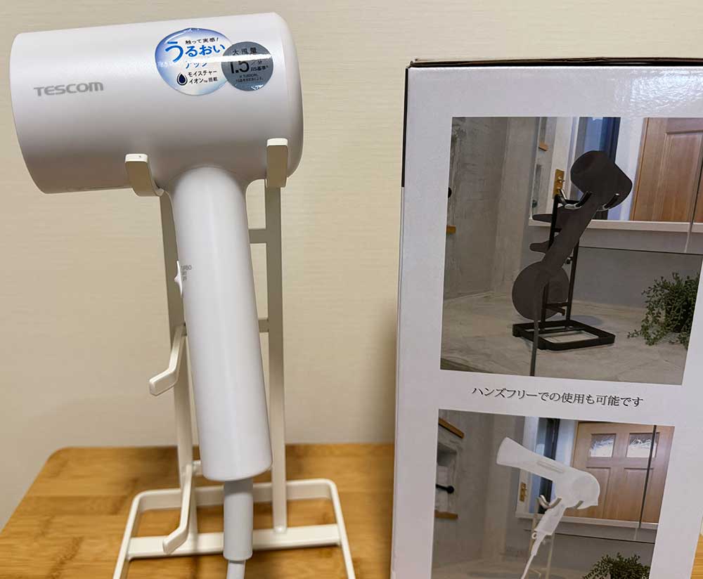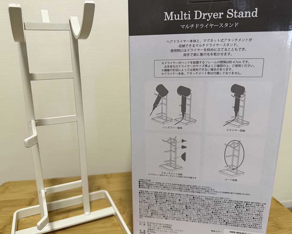 ドライヤーの収納用にも、ハンズフリーで乾かす時にも使えるというもの。